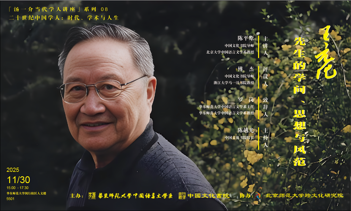 为纪念王元化先生,中国文化书院与华东师范大学中国语言文学系将共同主办“汤一介当代学人讲座”第八讲。讲座以“王元化先生的学问、思想与风范”为主题,将于2025年11月30日,在华东师范大学闵行校区人文楼5501会议室开讲。