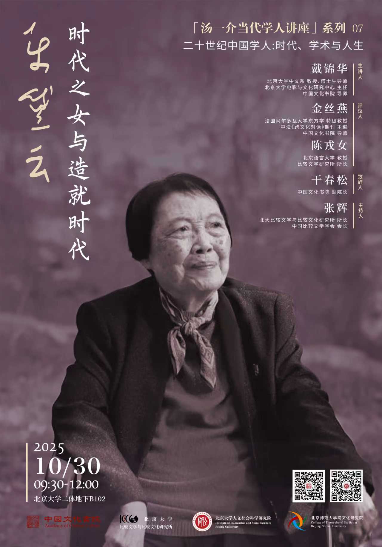为纪念乐黛云先生,中国文化书院、北京大学比较文学与比较文化研究所、北京大学人文社会科学研究院、北京师范大学跨文化研究院共同主办“汤一介当代学人讲座”第七讲暨《汤一介当代学人讲座文集》新书发布会。讲座以“乐黛云——时代之女与造就时代”为主题,将于2025年10月30日(周四)上午9:30-12:00,在北京大学第二体育馆B102报告厅开讲。