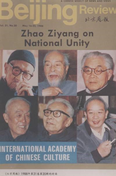 上图:1998年《北京周报》封面,照片左起梁漱溟、冯友兰、张岱年、季羡林、金克木、汤一介先生,介绍中国文化书院