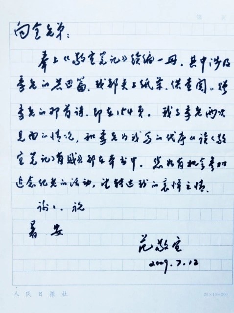 隔日,7月12日早8点,电话再次响起。范总来电说,“书已放在传达室了,你来取吧”。拿到书,附有范总的手札:“向全老弟:奉上《敬宜笔记》续篇一册,其中涉及季老的共四篇,我都夹上纸条,供查阅。赠季老的那首诗,即在154页。我与季老两次见面的情况,和季老为我写的代序《读< 敬宜笔记> 有感》,都在本书中。您如有机会参加追念季老的活动,望转达我的哀悼之情。谢谢!祝暑安!范敬宜 2009年7月12日。”