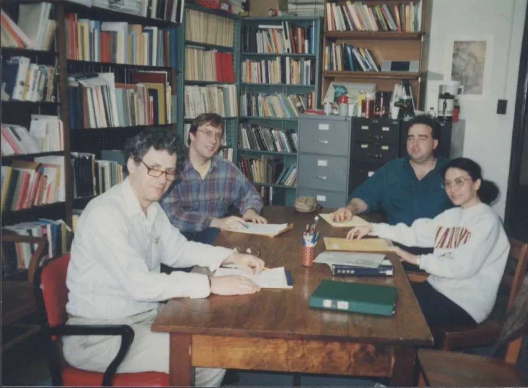在美国爱荷华大学做博士后(左一:欧达伟教授(Prof.David Arush),右一:董晓萍,1994)
