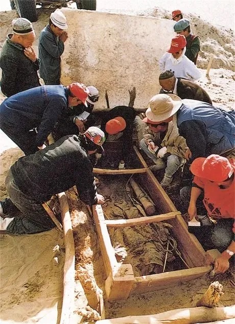 1995年尼雅N1遗址M3墓地开棺现场(右侧前二为王炳华)。三联书店供图