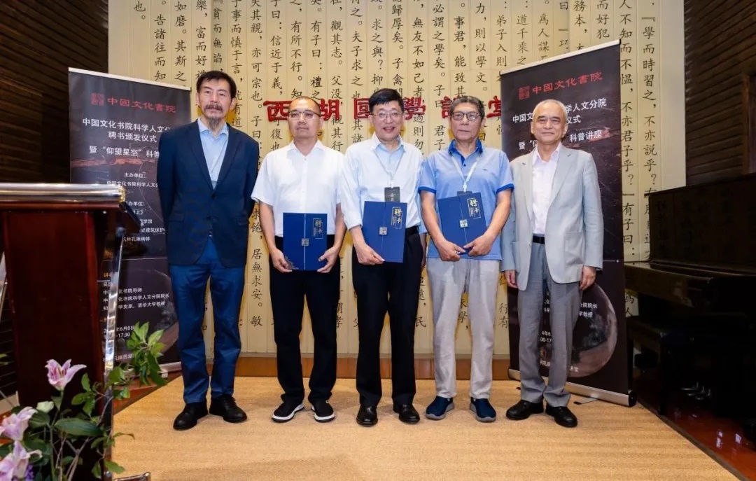 (2024年6月8日中国文化书院科学人文分院聘书颁发仪式上,陈越光院长、李林副院长为陈嘉映、张文江、张卜天颁发导师聘书;中间为张文江教授。)
