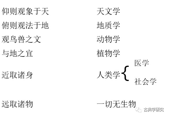 若八卦之作,本诸外物。曰“仰则观象于天”者,今曰天文学,包括气象学;曰“俯则观法于地”者,今曰地质学,包括矿物学和水利;曰“观鸟兽之文”者,今曰动物学,包括仿生学;曰“与地之宜”者,今曰地理环境,包括植物学;曰“近取诸身”者,今曰人类学,包括生理学、心理学和医学;曰“远取诸物”者,今曰物理学,包括化学。当八卦既作,“以通神明之德”者,今曰社会科学;“以类万物之情”者,今曰自然科学。我国先秦之学者,能有如是明确概念,以分析宇宙中一切现象,文化之发达可喻,《周易》之价值亦可喻。[5]
