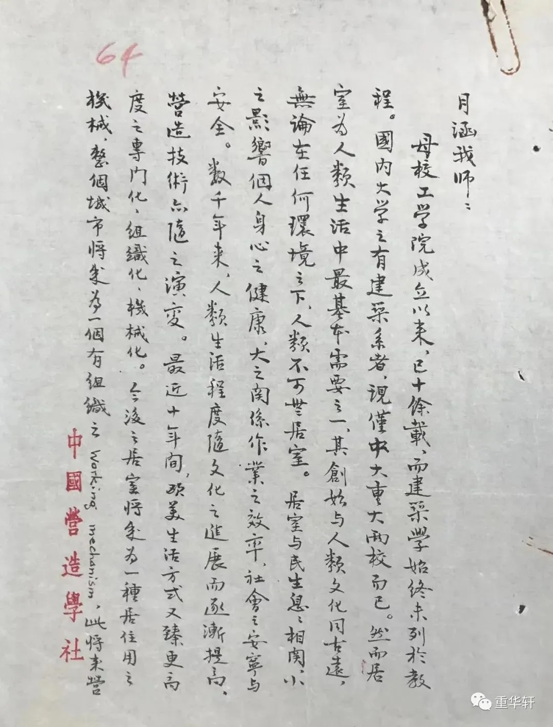 总之,第一次与她谈话,她那谈锋一点不像病人,我也极其兴奋,猛想起她是病人,立即辞去。临走时,她还说,等你好久了,你来了,太高兴了。建筑系设在水力楼二楼上,只是几间空房子,学生已到校,要忙开学,教室、图板、画图凳已有了,其他什么也没有,于是赶紧把图书馆五种柱式的书调来,描示范图,晒蓝图,先把《画法几何课》开起来,《素描》课上起来……需要说明的是,吴柳生是尊敬而亲切的长者,也很懂建筑,但专业的事他不太过问,他完全做到能协助的一切。这里主要谈林先生在建筑系的贡献。