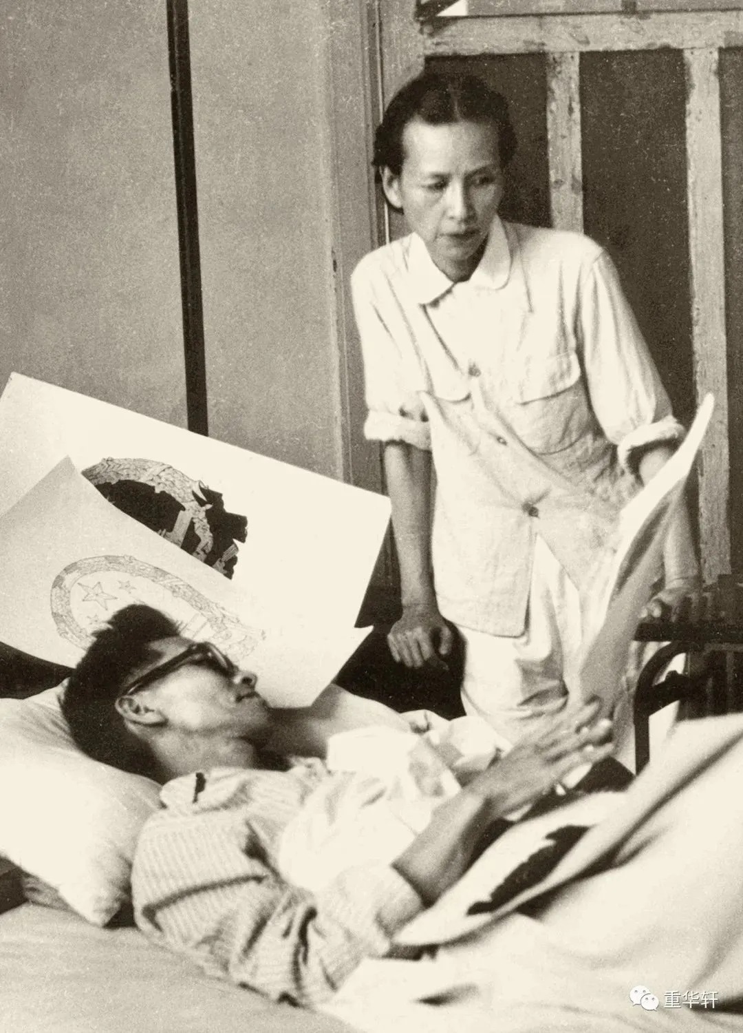 1950年 ,卧病在床的梁思成与林徽因讨论国徽方案 1950年