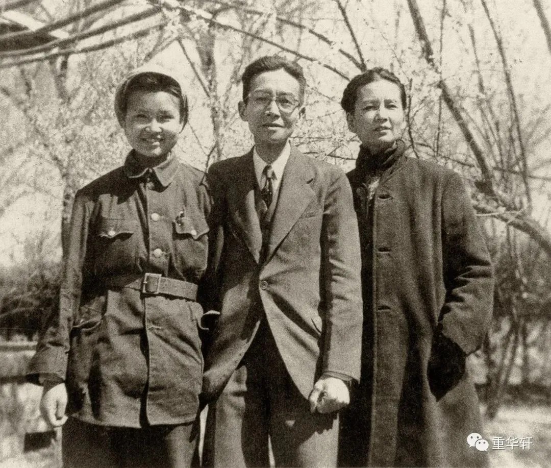 1949年 梁再冰南下参军之前 在清华大学新林院与父母合影,(左起)梁再冰、梁思成、林徽因