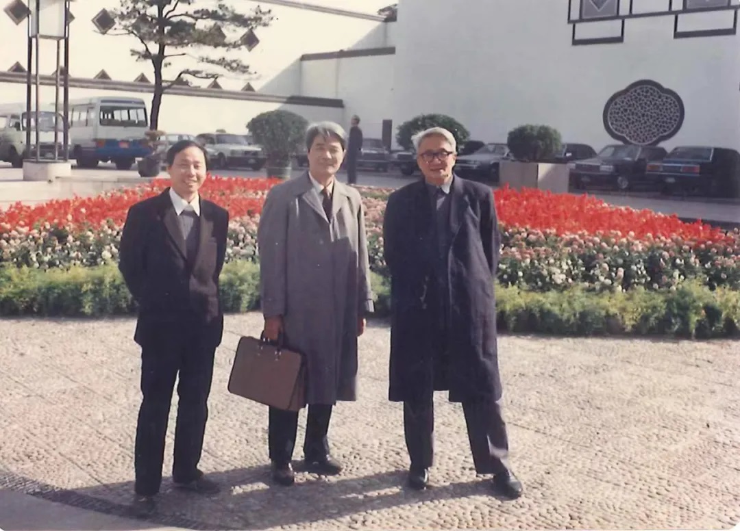 庞朴先生(中)、萧萐父先生(右)与郭齐勇先生与1987年重阳节在香山饭店出席梁漱溟九五初度会议时合影