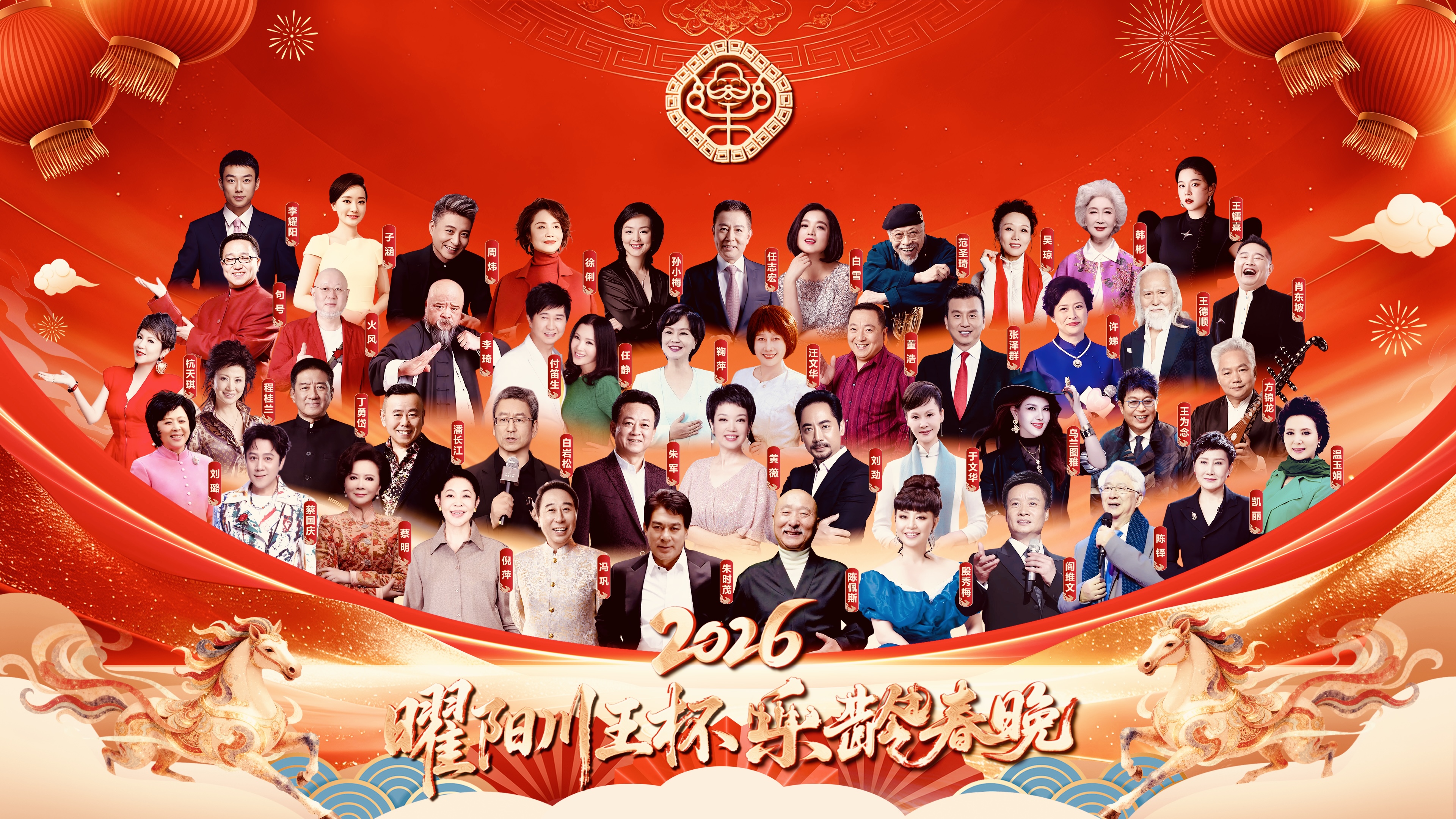 陈佩斯、朱时茂、殷秀梅、陈铎、冯巩、阎维文、倪萍、刘璐、凯丽、丁勇岱、温玉娟、白岩松、汪文华、鞠萍、蔡明、潘长江、蔡国庆、董浩、徐俐、张泽群、任志宏、孙小梅、于文华、付笛生、任静、王为念、程桂兰、许娣、吴琼、刘劲、杭天琪、李琦、句号、火风、方锦龙、白雪、姜铁红、乌兰图雅、范圣琦、王德顺、韩彬、周炜、肖东坡、王镭熹、水晶乐坊女子队等百余位文艺名家,在总导演黄薇、资深主持人朱军、中国教育电视台主持人子涵、河北广播电视台主持人李耀阳的联袂主持下,打造了一场兼具文化深度与银发活力的新春盛宴。